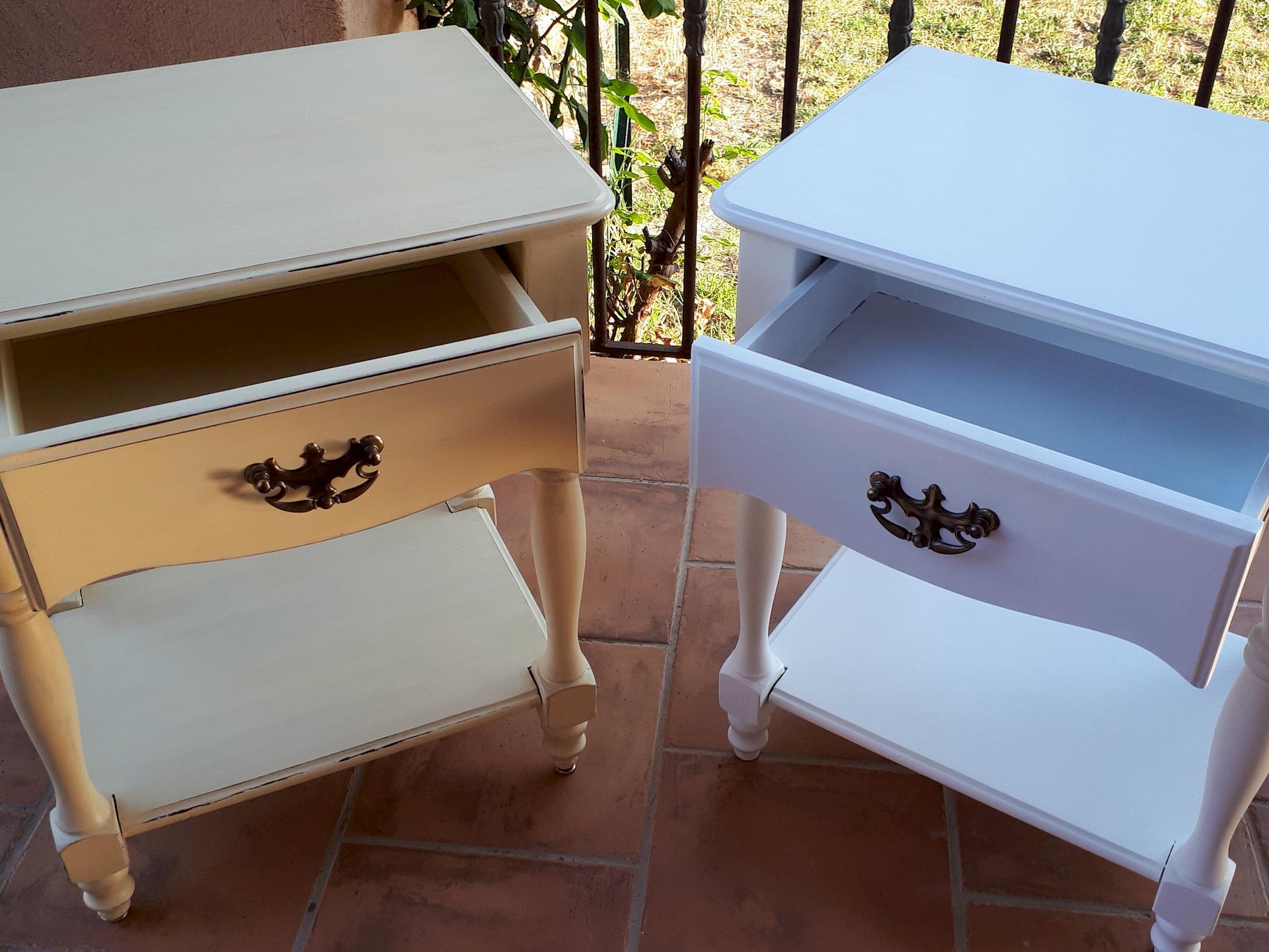 Il y a des meubles dont on se lasse de sa couleur trop foncée, trop vieillotte ou alors on a tout simplement envie de changer de style pour l’adapter à une décoration plus moderne.  Par conséquent, Je vous présente un chevet à pieds balustre, un ivoire patiné et l’autre blanc satiné.