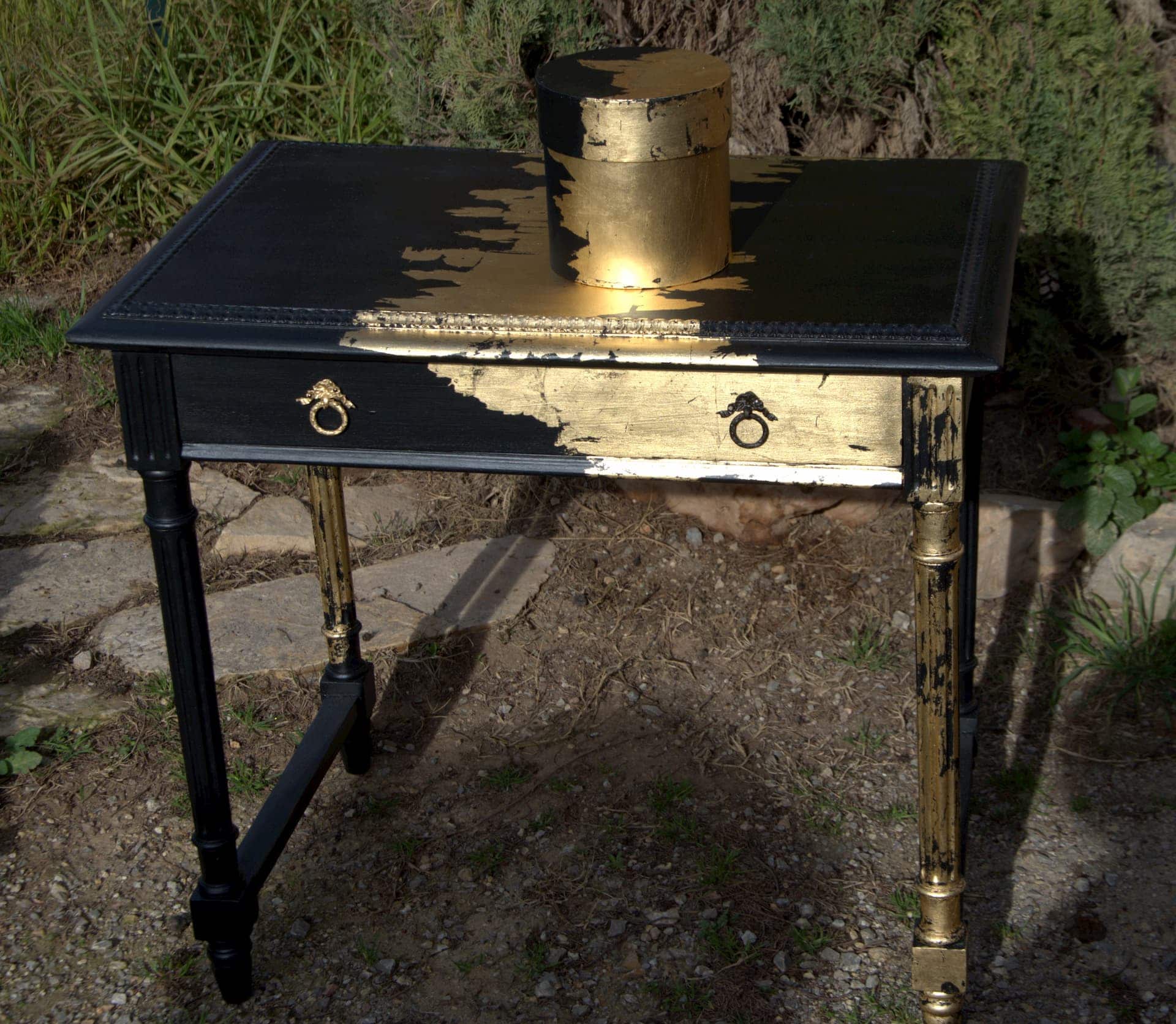 Voilà, cette ancienne coiffeuse revisitée en console est revêtue maintenant d’une peinture bois noire. Pour un design plus moderne, on décide de lui appliquer de la feuille de cuivre à l’aide d’une mixtion et de laisser son imagination pour le motif.