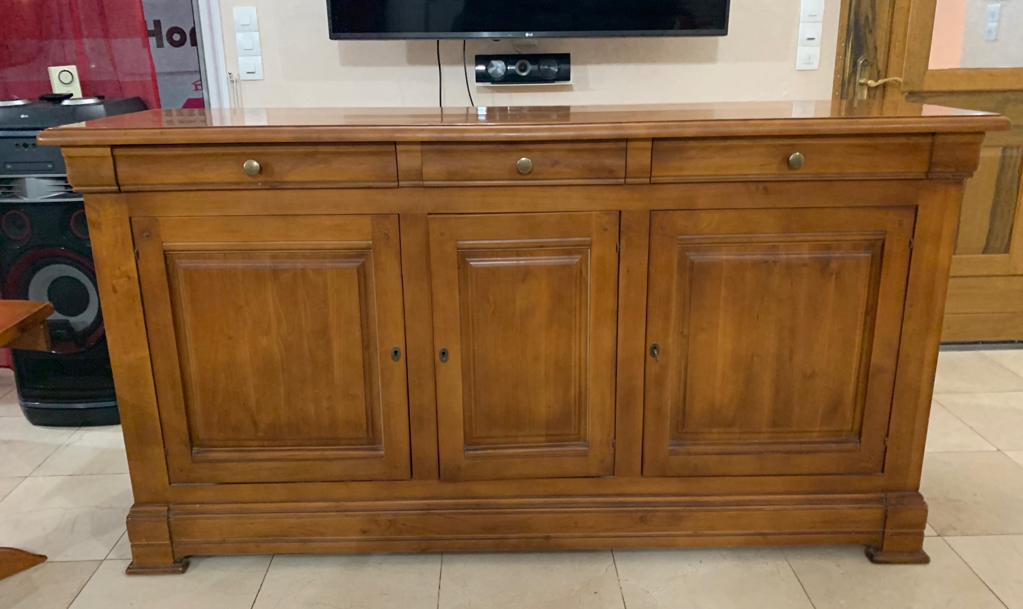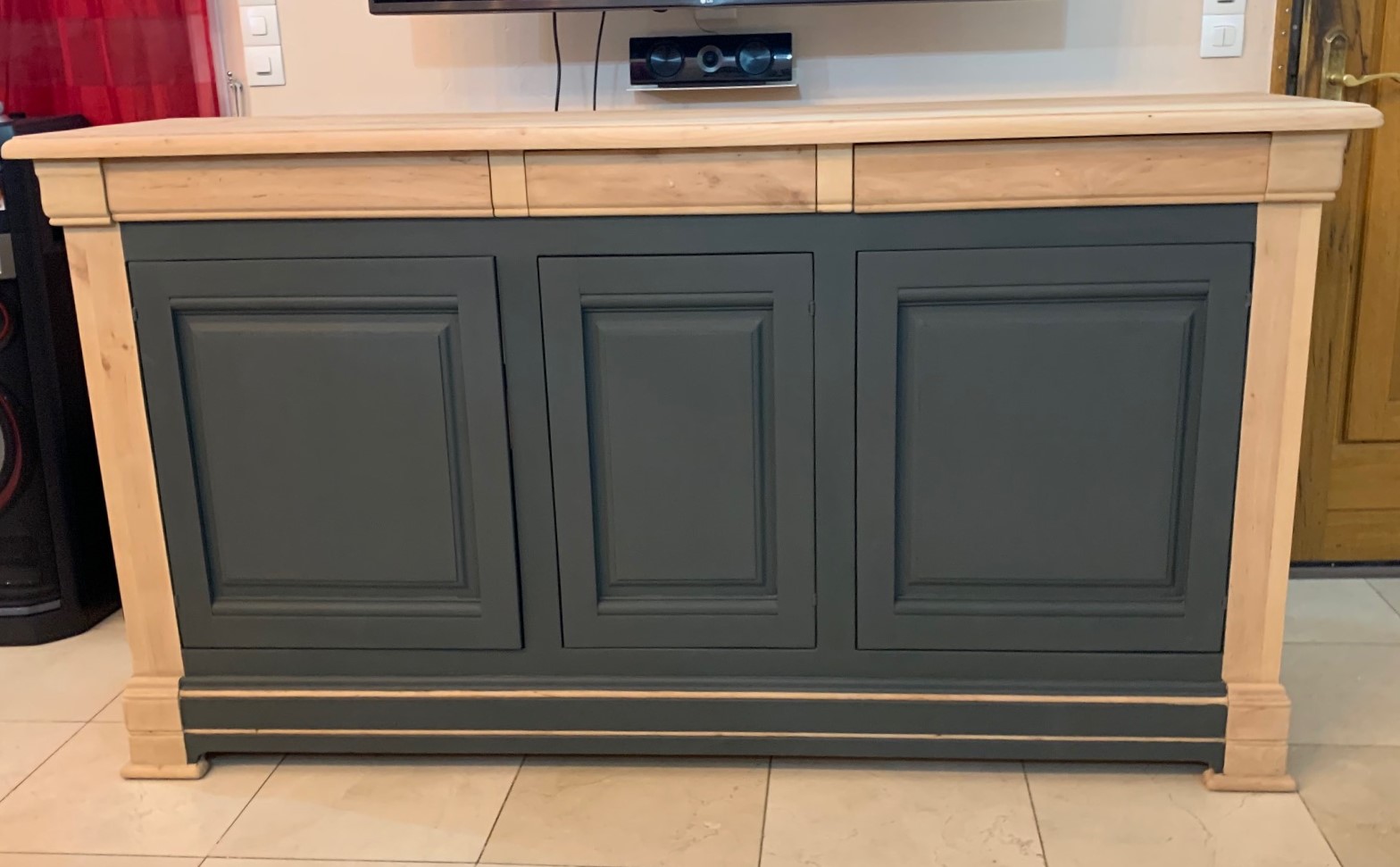 De nos jours on préfère un bois brut moderne que du vieillot. Dans cette publication plusieurs meubles sont transformés entre autre cette enfilade en orme massif. Un mobilier de qualité relooké pour une décoration d’intérieur plus élégante, même si la couleur est foncée, cette association de bois brut et de couleur réchauffe la pièce.