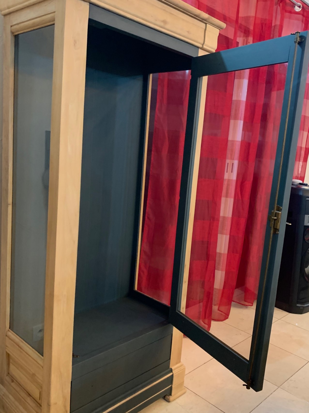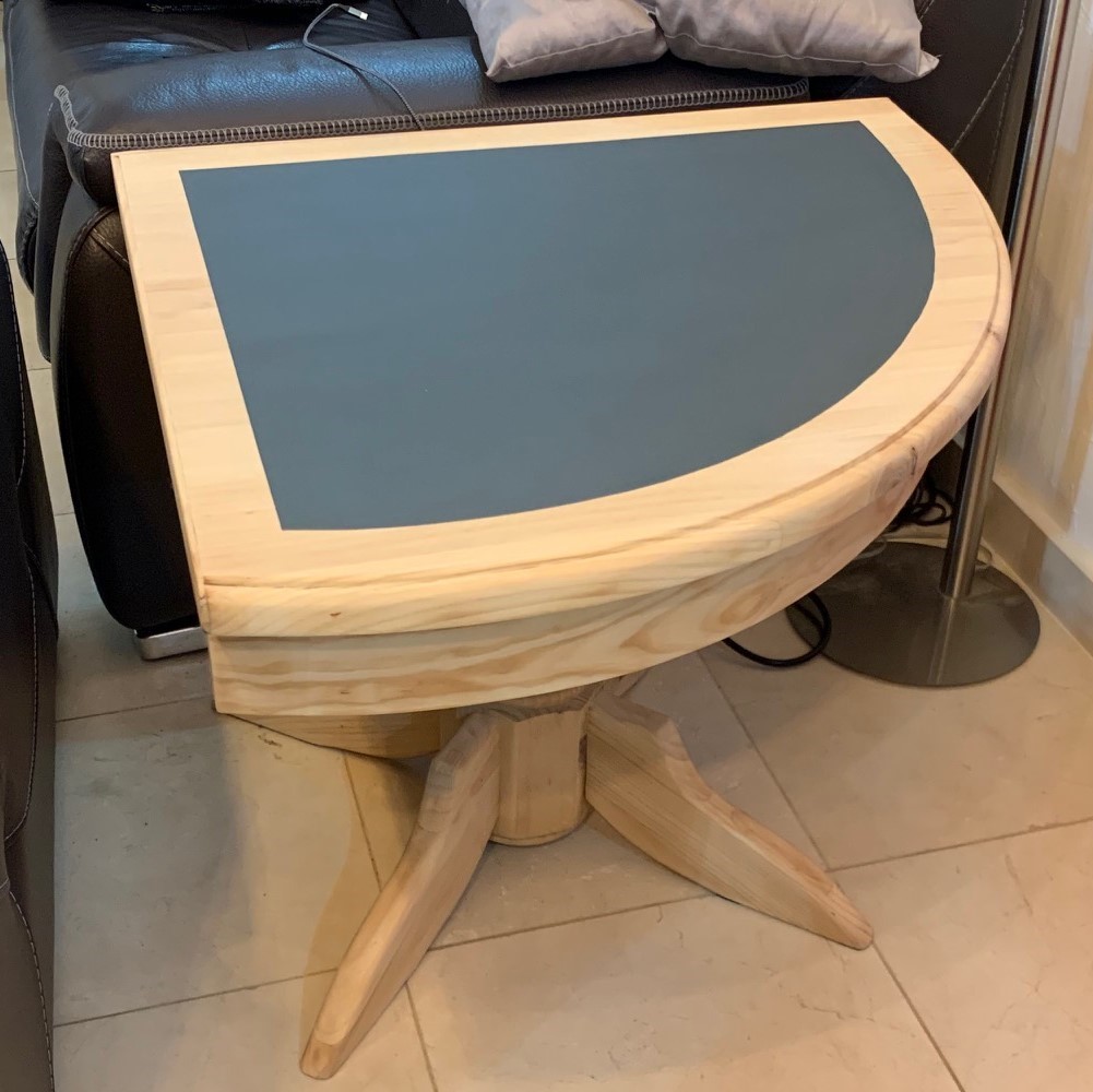 Donc, décapage à l’aérogommeuse de l’enfilade, des portes recto/verso, des façades des tiroirs, rebouchage des trous de poignées pour en mettre d’autres. En ce qui concerne la vitrine, l’extérieur seulement, la porte recto/verso et façade de tiroir. Le plateau de la table en pin poncée. Egrainage du tout pour un rendu parfaitement lisse. Le projet est de rappeler la couleur anthracite comme un meuble de cuisine.