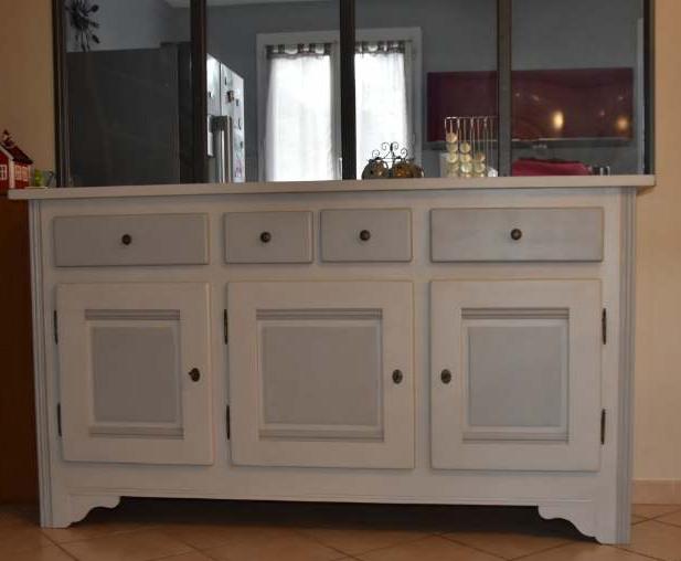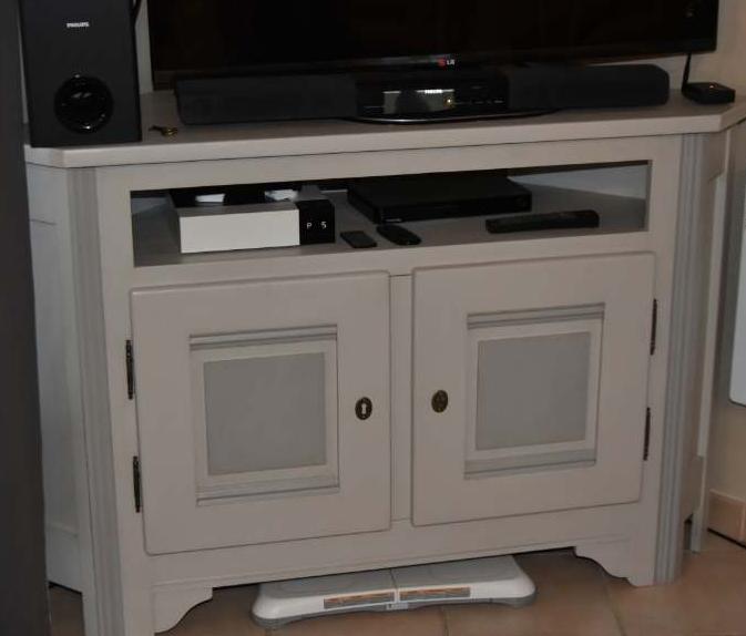 Nous avons choisi une couleur gris sur taupe afin de donner plus de cachet. Application en deux couches . Il en est de même pour la patine et pour la finition vernis mat. Ne pas oublier d’égrainer entre chaque couche.