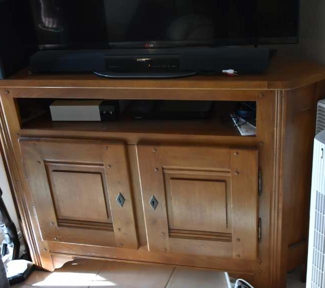 Une salle à manger à relooker comprenant un meuble d’angle, une table rectangulaire et une enfilade. Ici nous commençons par le meuble d’angle chêne et placage.