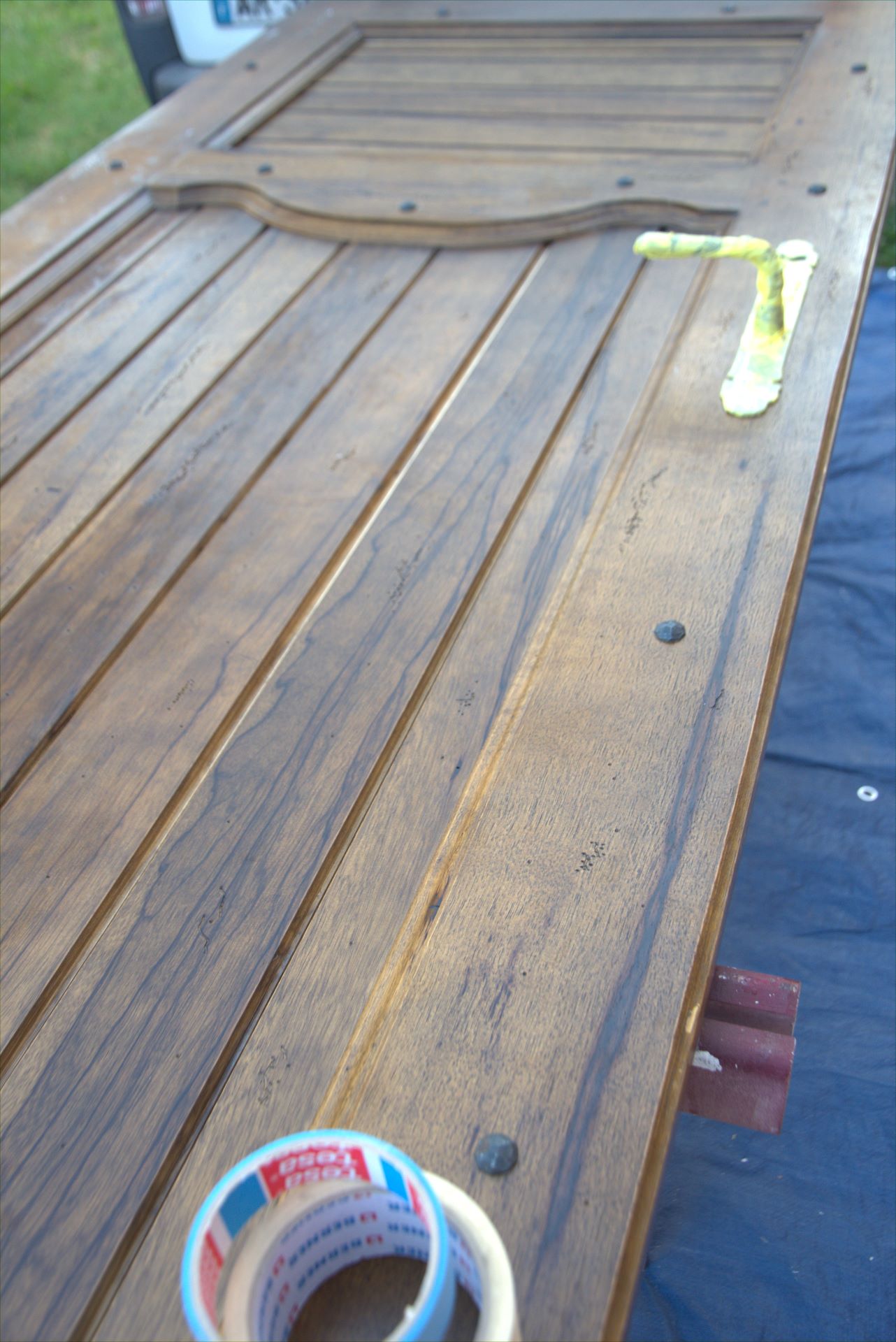 En ce qui concerne la porte, posez la sur des tréteaux. Masquage de la poignée et du système de serrure pour la suite des opérations.