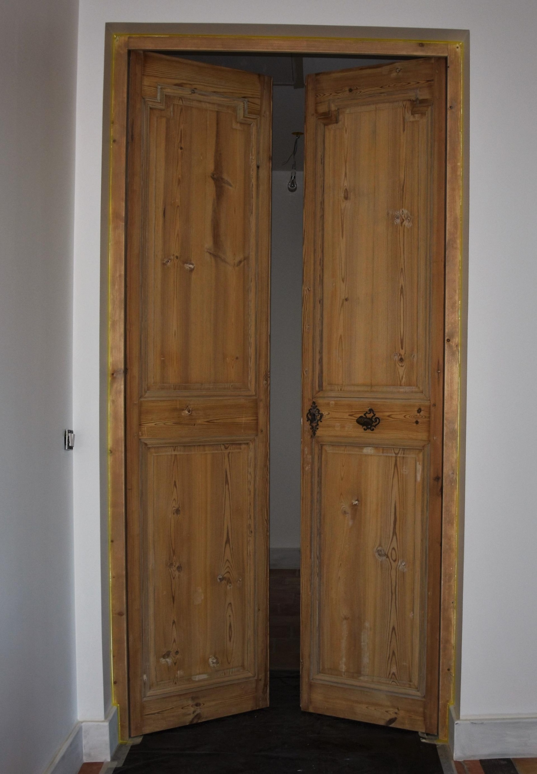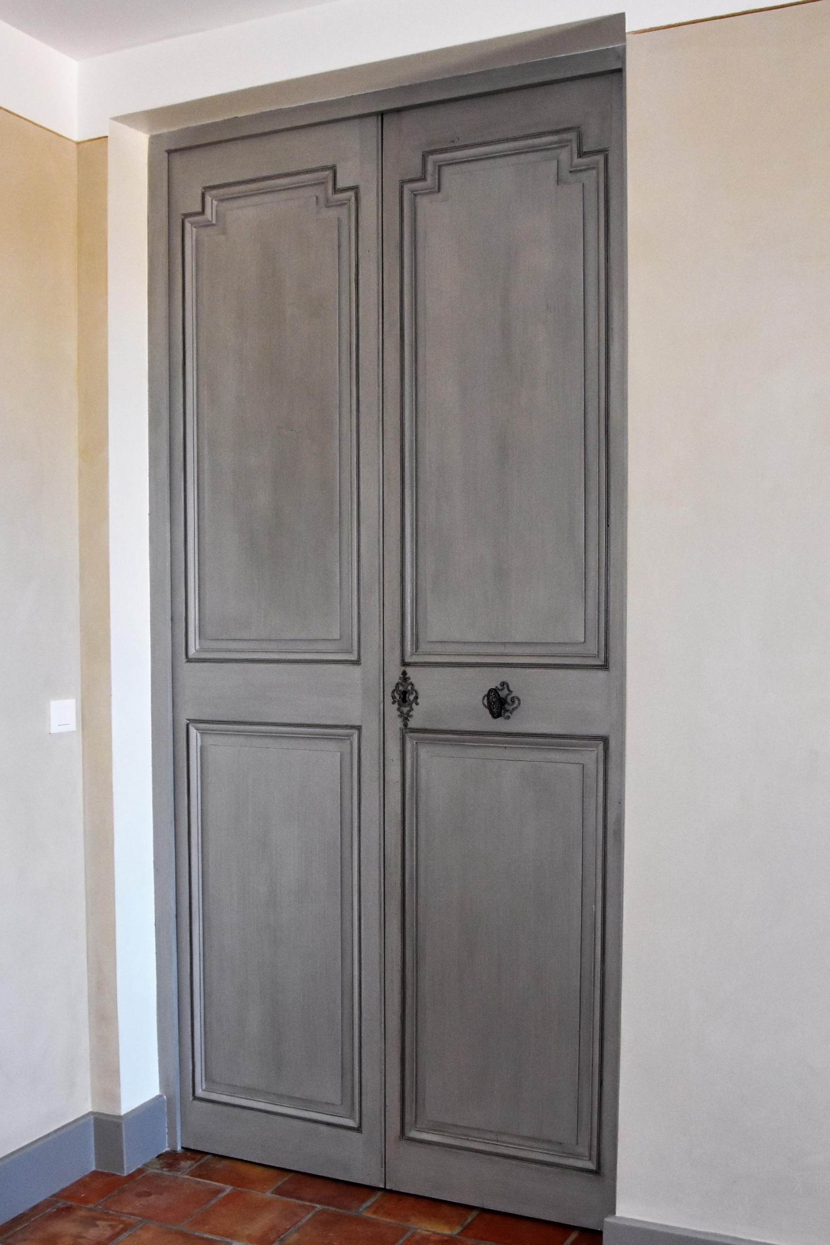 Ici, nous sommes sur un chantier de rénovation d’un bâtiment, une annexe à la bastide dans le var. Tout corps de métier est présent pour ce projet. Ma partie à moi est de mettre en valeur par une patine, cette belle porte d’époque Napoléon III en pin, en harmonie avec la peinture à la chaux du peintre. Un vrai travail d’équipe.