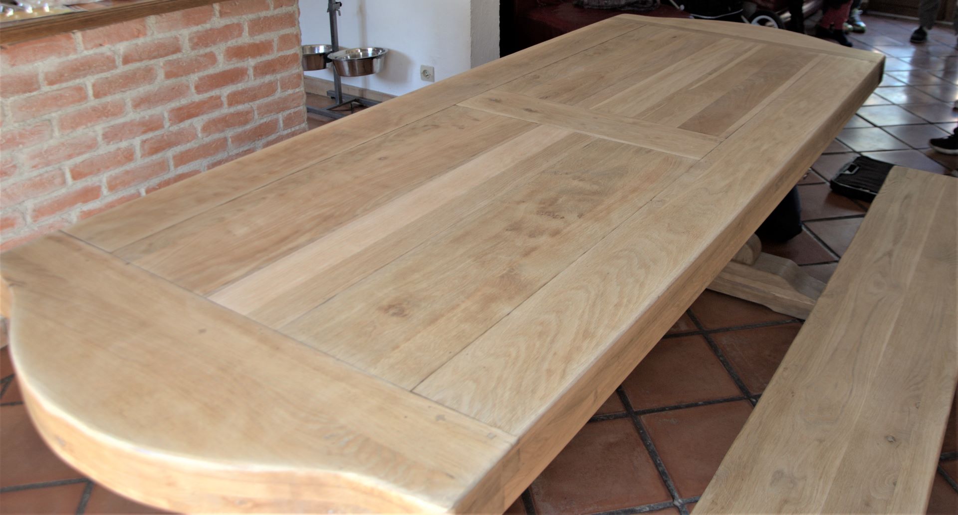 Pourquoi chêne et hêtre, c’est parce que la table et les bancs sont en chêne et que le bahut est en hêtre avec du placage.
