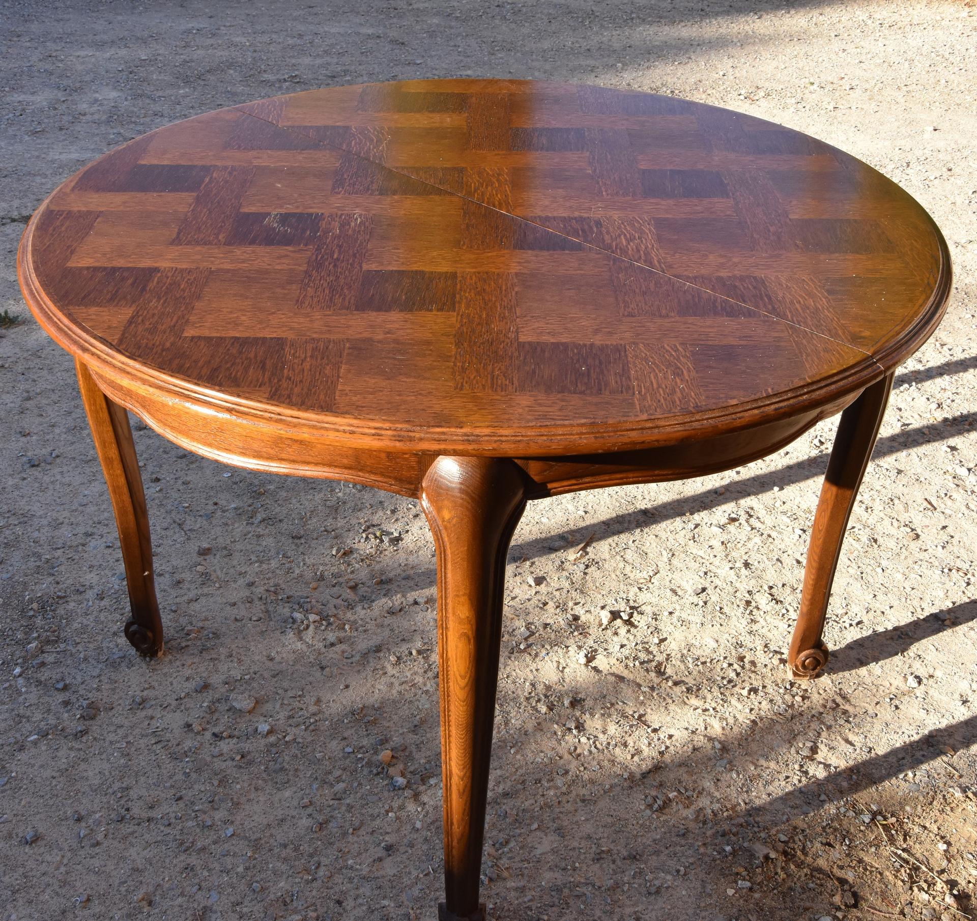 Table de salle a manger ronde de style régence en bois de placage, plateau marqueté, 1 rallonge