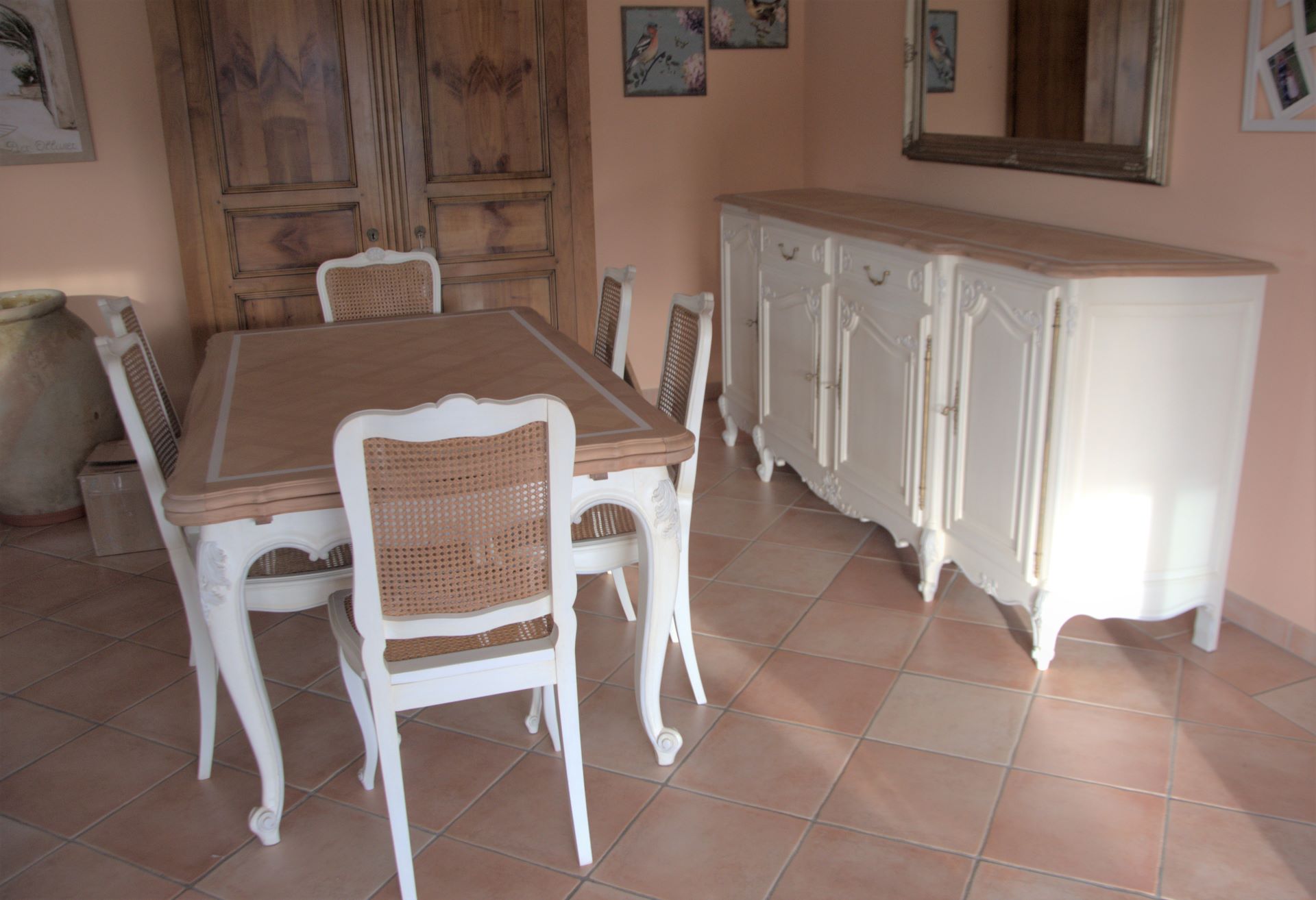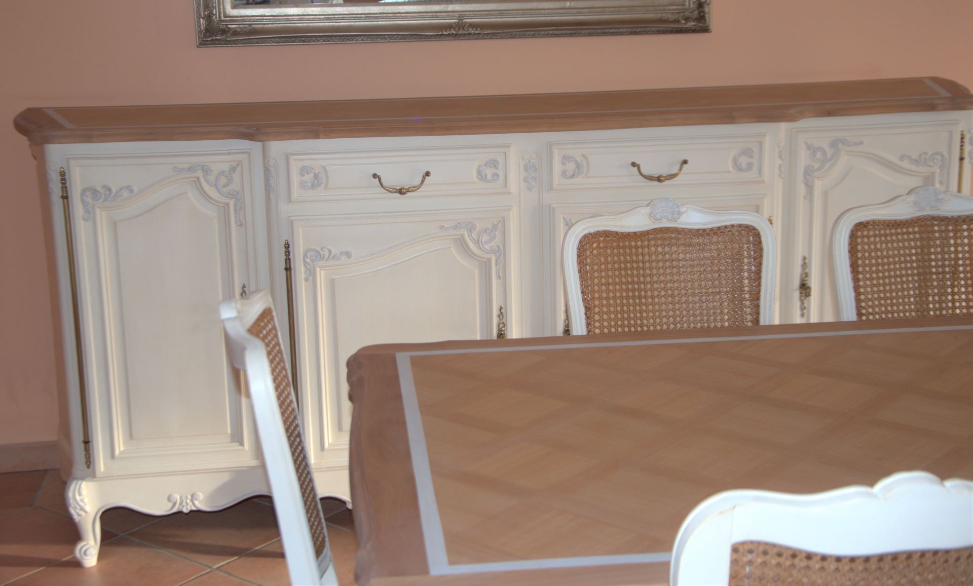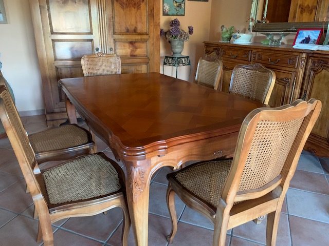 Relooking complet pour cette salle à manger merisier et placage de style régence. Pourquoi placage, car les panneaux centraux de l’enfilade, son plateau et celui de la table ne sont pas en massif