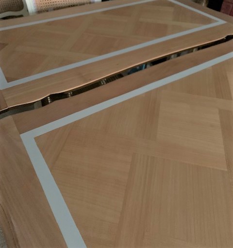 Donc comme énoncé ci-dessus, bien faire attention car ici on décape à la ponceuse tout doucement afin de ne pas abîmer les plateaux et les rallonges. De plus il faut garder la marqueterie. Le piètement, aérogommage complet pour bien ôter le vernis des sculptures florales. En ce qui concerne les chaises, ponceuse et décapant sur les parties autour du cannage. Un travail très long voir deux chaises par jour.